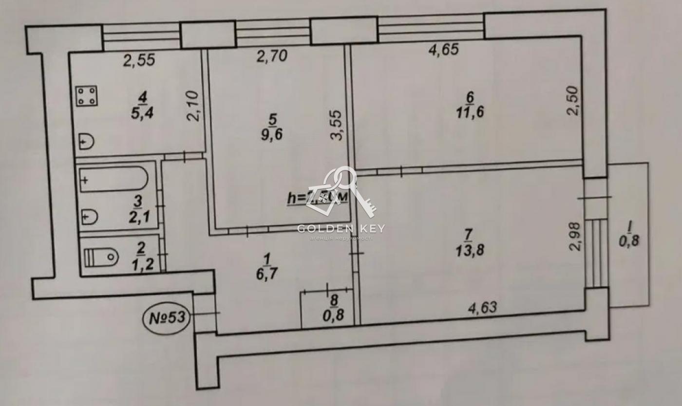 Квартира розташована на другому поверсі п’ятиповерхового будинку. Загальна площа 54 м2, житлова 35 м2, кухня 6 м2. Планування суміжно-роздільне, кімнати світлі і теплі. Санвузол роздільний, встановлена ванна, для підігріву води є газова колонка. Вікна і балконний блок нові, металопластикові, сам балкон у рідному стані. Опалення централізоване. Квартира під ремонт, що дає можливість втілити всі свої мрії.